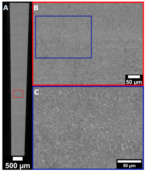Samples were vertically cross-sectioned and examined for microstructural features. Analysis of the full-Co samples is included in Figure 7, Figure 8 and Figure 9 while the Co-lean microstructural details are presented in Figure 10, Figure 11 and Figure 12. There was low deviation between samples by this method and a representative microstructure of a full-Co sample is included below in Figure 7, and a representative microstructure of a Co-lean sample is included below in Figure 10. Throughout the cross-sections an equiaxed microstructure was prevalent with a finer grain “skin” (thickness of ~200–260 µm for full-Co), which was thinner than previous alnico DED builds, including the Co-lean in this study [16]. Increasing the grain aspect ratio along the vertical (build) direction is preferred, and would be beneficial towards increasing the magnetic remanence and energy product values.