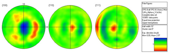 Orientation information from the region of the Co-lean sample 8 shown in Figure 10 with PFs for the {100}, {110}, and {111}-type planes (top) and IPFs for the sample X, Y, and Z directions (bottom). Of note is the lack of apparent texturing.