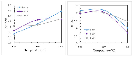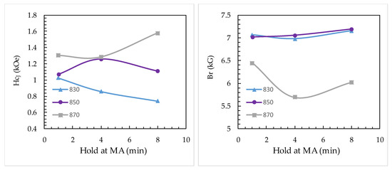 The number of EBM/PBF alnico samples allowed for magnetic properties to be studied (Figure 18; Figure 19) for various MA temperatures and hold times. The MA, which is responsible for establishing the initial nanostructure, was varied between 830 °C, 850 °C and 870 °C and for 1, 4 and 8 min. The FHT process further increases the magnetic properties regardless of the MA process and has been studied in detail elsewhere [28]. It should be noted that Figure 18; Figure 19 are plotted with respect to the MA temperature or hold time.