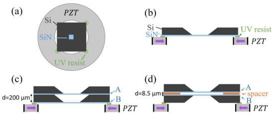 The membrane resonators used in this work are commercial [], high tensile stress (0.7–0.9 GPa), stoichiometric SiN square drums with lateral dimension 500 m and thickness 100 nm, deposited on a Si frame with lateral dimension 5 mm and thickness of either 200 or 500 m. As described in [] and depicted in Figure 1a,b, three corners of a Si chip were glued by application and curing of a small dab of UV-resist (OrmoComp, Micro resist technology GmbH) onto a piezoelectric ring actuator with 6 mm inner diameter (Noliac NAC2123) to which both dc and ac voltages can be applied. Following the method of [], double-membrane arrays were made by gluing the two chips together either on top of each other (Figure 1c), so that the intermembrane separation was given by the Si frame thickness (200 m in this case), or with a spacer in between the SiN films setting the separation between the suspended membranes to be m (Figure 1d).