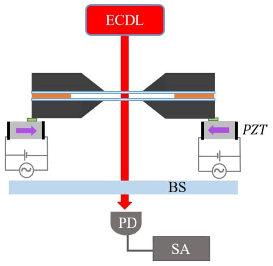 The vibrations of the membranes can then be measured by monitoring the transmission of monochromatic light ( nm) issued from an external cavity diode laser through a linear Fabry–Perot interferometer constituted by the membrane—or membrane array—and a 50:50 beamsplitter mirror positioned parallel to the membranes at a distance of approximately 7 mm (Figure 2). The fluctuations of the transmitted light are detected with a fast photodiode and analyzed with a narrow resolution bandwidth spectrum analyzer. The wavelength of the light is chosen so as to maximize the sensitivity of the interferometer to the displacement of the membrane modes considered []. The mechanical resonance frequencies can be determined by Lorentzian fits to the thermal noise spectrum, typically recorded with a resolution bandwidth (RBW) of 0.5 Hz and averaged 500 times. The mechanical quality factors are determined either from the results of the Lorentzian fits to the thermal noise spectrum, or by performing ringdown spectroscopy of the resonantly excited mode [,].