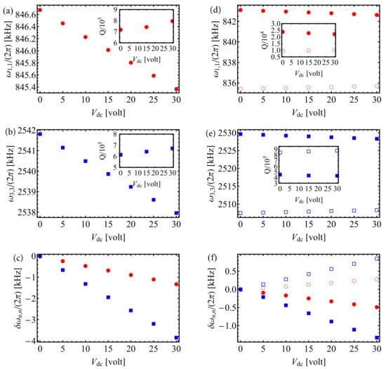 (a,b) Measured single membrane (1,1) and (3,3) mode frequencies as a function of bias voltage . (c) Corresponding resonance frequencies shifts versus . (d,e) Measured (1,1) and (3,3) mode resonance frequencies of the A (red circles and empty blue squares) and B (red dots and filled blue squares) membranes in a double-membrane array as in Figure 1c, as a function of . (f) Corresponding resonance frequency shifts versus . The error bars are smaller than the size of the data points. The insets in (a,b) and (d,e) show the variations of the mechanical quality factors with .