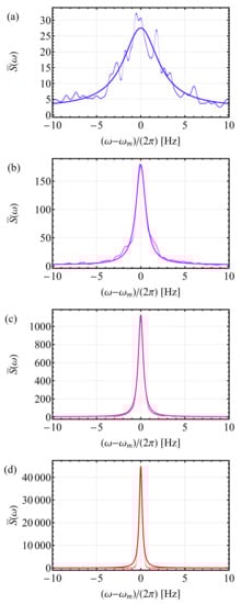 Figure 5 shows examples of noise spectra of membrane B’s fundamental mode, obtained for a bias voltage corresponding to a frequency separation Hz, and for increasing modulation amplitudes (see Supplementary Materials for the complete spectrum dataset). The modulation amplitudes were normalized to the parametric threshold voltage and the same resolution bandwidth of 0.5 Hz is used for all spectra. The results of Lorentzian fits to the data are also shown. It can be seen that the amplified noise spectra are generally well-approximated by Lorentzians with increasing peak value/area and reduced linewidth, as the parametric modulation amplitude is increased.