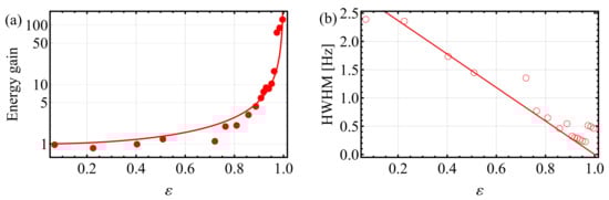 (a) Energy gain as a function of the normalized parametric modulation amplitude for membrane B’s fundamental mode at a bias voltage corresponding to Hz. The solid line shows the result of a fit according to Equation (15). (b) HWHM of the noise spectra resulting from the Lorentzian fits, as a function of . The solid line shows a linearly decreasing function of the form .