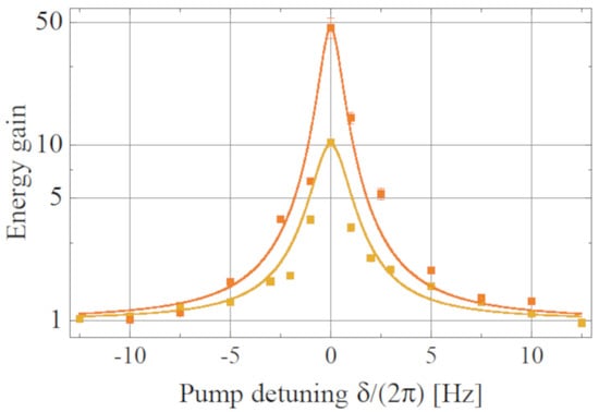 The resonant nature of the parametric excitation was also verified by scanning the modulation voltage frequency around the second harmonic frequency. Figure 7 shows the variation of the energy gain—deduced from the noise spectra as previously—as a function of the pump detuning , for the fundamental mode of membrane B at a bias voltage such that Hz and for two different parametric modulation amplitudes close to the threshold. The solid lines show the theoretical predictions of Equation (15), in which is determined by the zero-detuning value and is the HWHM measured in absence of modulation.