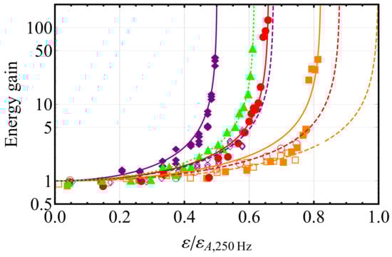 Energy gains as a function of normalized modulation amplitude for both fundamental modes for increasing , such that Hz (yellow squares), 30 Hz (red circles) and −100 Hz (purple diamonds). The empty and full symbols are for membranes A and B, respectively. The green triangles correspond to the energy gain measured at the degeneracy (). The modulation amplitude is arbitrarily normalized to the threshold amplitude for membrane A’s fundamental mode at Hz. The solid lines show the results of fits to Equation (15).