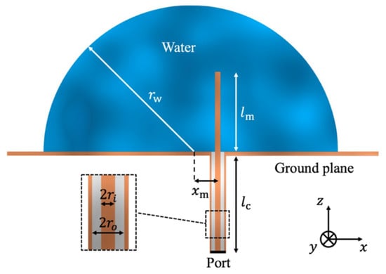 The water-based DRA is shown in Figure 1. The hemispherical cavity has radius , and the feed line is a coaxial transmission line with an inner and outer radii of mm and mm, respectively, and a dielectric material with the relative permittivity of . The characteristic impedance of the feed line is Ω, and its length was set to mm in the numerical model. The monopole of length is displaced from the center by distance . A Cartesian coordinate system was introduced, as shown in Figure 1. The permittivity of water was described by the Debye model [12]. A model of the water-based DRA was built in COMSOL Multiphysics 5.3 [28], which was used in all numerical calculations. The model consisted of the DRA enclosed by a hemisphere of free space and with a perfect electric conductor (PEC) plane as the ground. An outer perfectly matched layer (PML) terminated the free-space hemisphere. A matched port was placed on the bottom of the transmission line, as shown in Figure 1. The input power was set to 1 W.