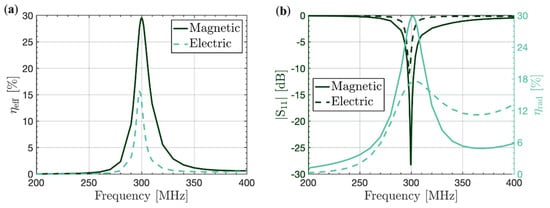 We designed the antenna to operate at 300 MHz and 20 °C, where the relative permittivity of water was 80.2 − j1.34. However, to study the influence of the dispersion of water, we compared it with an antenna designed for 1000 MHz, where the relative permittivity of water was 79.9 – j4.46, clearly showing higher losses. We used two designs exciting different resonances in the hemisphere. With the PEC plane imaging the induced volume currents inside the hemisphere, the resonances will effectively be similar to the ones in the full sphere (the resonant properties of spherical configurations are known [29] also when water is used as the dielectric [30] and were utilized presently for the design of water-based DRAs. See also Appendix B.1 for more details). After a systematic parametric study of the two parameters and , the most efficient designs were found, and the final results are summarized in Table 1 for both frequencies. The total efficiency () is shown as a function of frequency in Figure 2a for both designs. At 300 MHz, a magnetic (electric) dipole resonance could be excited in a sphere with the radius 55.18 mm (78.53 mm) equal to λ0/18 (λ0/14). The maximum total efficiency for the magnetic (electric) dipole antenna was 29.5% (15.6%). For comparison, the total efficiency without water was only 0.037% (0.0013%), with almost total reflection of the input power. Thus, introducing water not only matched the antenna to the transmission line but also to the ambient free space, as also confirmed by the reflection coefficient () and radiation efficiency () in Figure 2b. The magnetic dipole resonance in a water sphere is the most pronounced [30]. This was also the case here, as illustrated in Figure 2. However, due to the losses in water, both antennas absorbed (i.e., dissipated) more power than they radiated: the magnetic (electric) dipole antenna absorbed 70.1% (76.3%). Compared to the antennas at 1000 MHz, where the losses of water were even greater, we found that the total efficiency dropped by approximately a factor of 3 (see Table 1).