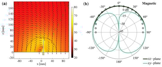(a) The electric field distribution in the -plane for the magnetic dipole antenna. The colors show the intensity of the electric field in logarithmic scale, whereas the arrows show the direction. (b) Radiation pattern shown by the normalized radiation intensity in the - and -planes for the magnetic dipole antenna. The black circles show the measured radiation pattern. See Appendix B.2 for the electric field intensity and radiation pattern for the electric dipole antenna.