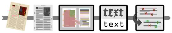 - Pletschacher, S.; Antonacopoulos, A. The PAGE (page analysis and ground-truth elements) format framework. In Proceedings of the IEEE 2010 20th International Conference on Pattern Recognition, Istanbul, Turkey, 23–26 August 2010; pp. 257–260. [Google Scholar]