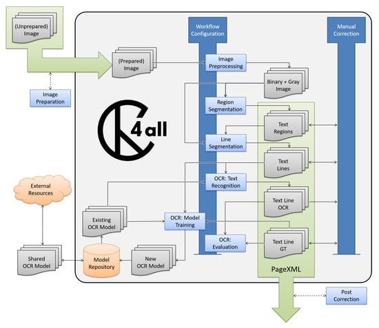Regarding our data structure, apart from different representations of page images, we focus on PageXML [] as the main carrier of information. This allows for a modular integration of the main submodules of OCR4all and sets up easy to fulfill requirements regarding interfaces, ensuring a reasonably straightforward addition of new submodules or replacement of existing ones. Additionally, defining a unified interface for all tools and modules enables the usage of a comprehensive post-processing functionality. Another positive side effect of this approach is that submodules developed by us for OCR4all can be integrated analogously into other OCR workflows that use PageXML.
