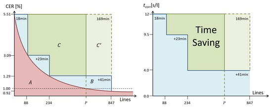 Left: Analysis of the ITA using C1541. The goal is to reach point P, which represents the (unknown) number of lines necessary to reach a CER of below 1%. In theory, the red curve describes the unknown relation between GT lines used for training and the achieved CER and therefore represents the theoretical ideal ITA that produces and applies a new OCR model after the transcription of a single new line of GT. The real route chosen by User 2B is shown by the blue stair case function. Green depicts a single training approach using the same final number of lines of GT as User 2B () and the perfect, but unknown number of lines (C). Right: This time, the -coordinate shows the manual effort necessary to correct a single error (which highly depends on the CER). The time saved by the ITA (in the case of User 2B and theoretically ideal) is represented by the green area minus the blue area. In this case, this represents a reduction of the manual effort by 51%, which equates to a speedup of 2.1.