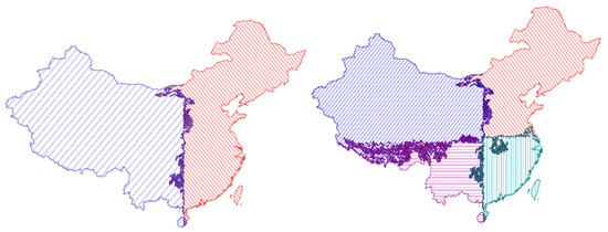 The experiment used a spatial union in map overlay analysis as an example to conduct parallelization experiments. The experimental data shows the Chinese 1:4 million land use map. The data type was multi-polygon, the number of elements was 15,615, and the number of points was 886,547 (Figure 8). The visualization strategy in Figure 8 is FID based strategy. The experimental dataset is a type of data commonly used in GIS applications, representing the general characteristics of spatial data decomposition. The spatial distribution of these maps data is irregular and unbalanced, and the amount of data is large. It is representative of experiments and has guiding significance for practical applications. Figure 9, Figure 10 and Figure 11 are the results for the parallel spatial union using fid decomposition, median decomposition, and middle decomposition. The number of the results for the decomposition method is 2, 4, 8, and 16, respectively. Different color denotes different class in these maps.