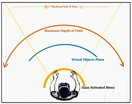 The proposed 3D UI is a dual-layer UI consisting of two main layers with curved screens (Figure 4). The upper layer (screen layer) is used for displaying the opened files. It allows the user to interact with multiple screens portrayed within a curved 360-degree effective field of view available for the user. While the lower layer (interaction layer) contains the traditional desktop tasks e.g., delete, duplicate, etc. Downward gaze allows the user to raise the interaction (lower) layer that facilitates several traditional desktop tasks. The effective field of view (FOV) of the 3D UI from the top is shown in Figure 5.