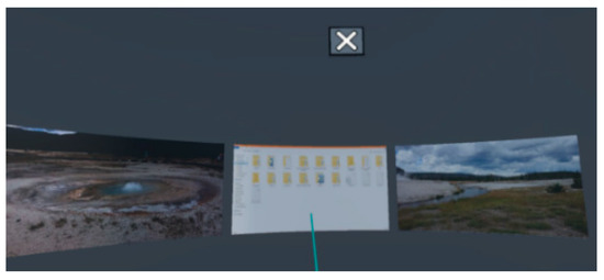 In this interface, the basic mouse interaction for the traditional desktop is adapted to a 3D laser pointer using one of the Vive controllers. The pointer has a blue laser light that gives an indication about where it is pointing to. Both hands can be independently used to control the pointer. Developing the idea of the laser pointer with some clicks, the user can interact with the 3D desktop in the immersive VR environment. An example of the user interaction in the point-and-click UI is shown in Figure 6. As mentioned above, the Vive controller is used to simulate the 3D laser pointer. The Vive controller has several input methods and only two of them are used, the trigger and trackpad. The trigger button is used for the tasks of opening, deleting, duplicating, and closing, where the users need to point to the intended place and then click the trigger. While the trackpad is used for scrolling and scaling tasks. The users need to move one finger on the touchpad right or left for scrolling, and up or down for scaling (zoom in or zoom out respectively). A summary of the desktop tasks and their corresponding interactions using the point-and click UI is found in Table 1. The menu is always displayed at the lower layer, the user can point and choose any type of objects.