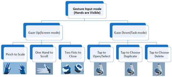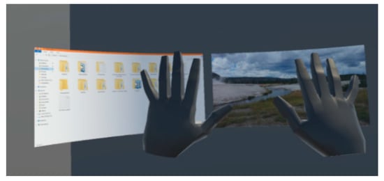 Thanyadit and Pong [30] presented a mirror metaphor for a desktop VR environment. Users can interact with a virtual object in front and behind a virtual screen using their hands. The study showed that the mirror metaphor can be effectively applied to a VR environment. Zhang [31] used leap motion and HMD-based VR to create a training system for miners. Their study showed the gesture and HMD-based VR training was more useful compared to a controller-based training. Jibin and Gao [32] presented a pen and touch input-based 3D desktop. They showed that performing 3D desktop tasks using touch gestures was more intuitive and efficient.
