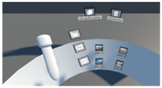 In this interface, a pair of Vive controllers is used for developing the interaction mode. The user uses both controllers to interact with objects in the immersive VR 3D desktop environment. The Vive controllers have sensors that are tracked by the base stations. A combination of controller’s inputs and movements was used to perform the desktop tasks. An example of user interaction in the controller-based DM UI is found in Figure 7. A visualization of both controllers (right and left) is also presented on the 3D UI, where each controller is named by a letter “R” or “L” to distinguish between them. Only two input methods for the Vive controller are used, the trigger button and grip button. The user can open, delete, and duplicate by pushing/taping the intended objects using one of the controllers (right or left one), it does not matter. While to close a certain object, the user needs to press the grip button using one of the controllers (right or left one), it does not matter. To perform the scrolling task, the user should move one controller right or left, while keeping the trigger button clicked on. Whereas to perform the scale task, the user should use both controllers; by moving the controllers away from each other (zoom in) or towards each other (zoom out), while keeping the trigger button on both controllers clicked on. A summary of the tasks and their corresponding interactions using the controller-based UI is found in Table 1. The user can display and access the menu that contains the different types of objects by flipping the left controller only.