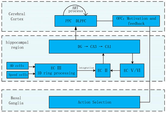 Sitting between the cerebral cortex and basal ganglia is the hippocampal region, which includes the hippocampus and the EC. This plays a crucial role in spatial learning and navigation [32], where external information (HD and speed information) are converted to expressions of the internal environment. The hippocampal region is an area where grid cells, HD cells, and speed cells converge to transfer place information to the place cells.