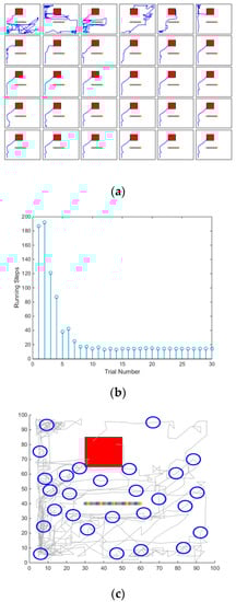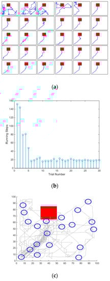Results of navigation with immobile obstacle. Red square represents the target, blue line is the path, and obstacles are shown by “***”: (a) Navigation trajectories results of 30 runs; first row is 1–6 runs, and so on. (b) Number of steps needed to reach the goal. (c) Map nodes (blue circle) were established during the exploration.