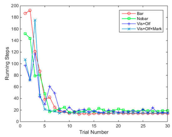 Comparison of steps required to reach the goal. Bar: Running steps of our model with immobile obstacle. Nobar: Running steps of our model with no obstacle. Vis+Olf: Running steps of [39] based on visual and olfactory cues. Vis+Olf+Mark: Running steps of [39] based on visual, olfactory, and self-marking cues.