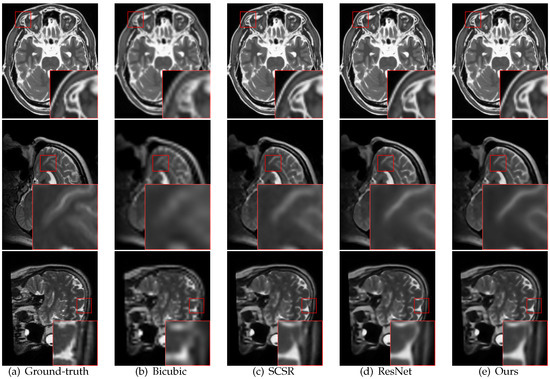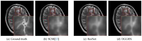For MRI images, high-frequency image details such as edge structures of the sulcus gyrus and the cortex, substantially impact the detection of suspicious structures, the classification of malformations, and diagnosis. Thus, many studies have considered high-frequency factors in MRI super-resolution [8,27,28,29,30]. For example, the interpolation approach improves the accuracy of edge reconstruction by introducing contrast guidance [29]. Facilitated by multi-contrast MRI, the missing MR image details are partly recovered by helpful information of the reference MRI data [13,31].