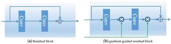 Illustration of the diffidence between the residual block and the proposed gradient-guided residual block: (a) a conventional residual block; and (b) the proposed gradient-guided residual block. In (b), the output of the convolutional layer is modulated by the output of the gradient subnet.