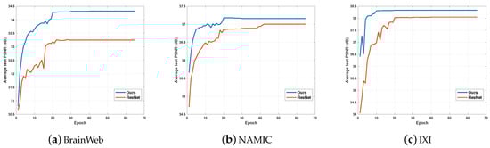 Convergence curve of DGGRN and ResNet with upscaling factor 2 on BrainWeb, NAMIC and IXI test sets. DGGRN achieves higher PSNR values than ResNet for all epochs.