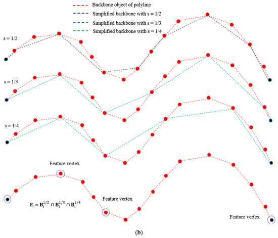 Here, we obtain three simplified objects with differential scales s = 1/2, s = 1/3, and s = 1/4 (see Figure 3b). We then calculate the feature vertices , which is a set of the common vertices of three simplified backbone as shown in Equation (5). From Equations (4) and (5), we can see that will be determined if . Figure 3b shows three simplified backbone objects of a polyline object with differential scales 1/2, 1/3, and ¼, and the feature vertices of the backbone object.