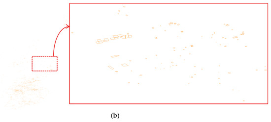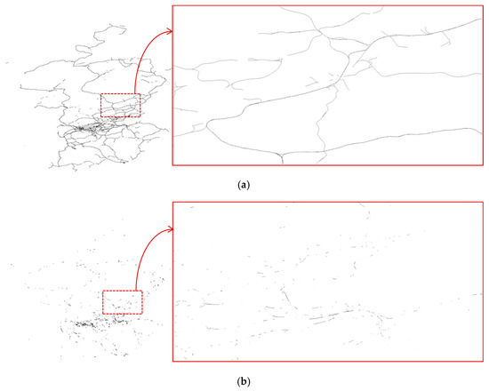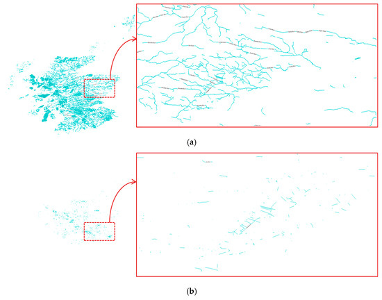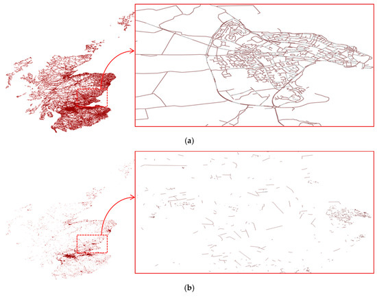 Experimental results are shown in Figure 5, Figure 6, Figure 7, Figure 8 and Figure 9, which show the original map and a part of the original map beside the encrypted map for comparison. Figure 5a shows the original railway map of Scotland and a part of the original railway map. The content of the railway map is presented by polylines. After encryption, polylines are altered, broken into segments, and positioned in a disorderly manner (Figure 5b). In the experiment with the land-use map of Scotland, the content of the map includes polygons (Figure 6a). After encryption, the shape of all polygons is changed to smaller polygons on the map, and the shape of the entire map is altered completely (Figure 6b). Experiments on the waterway map (Figure 7a), the nature map (Figure 8a), and the road map (Figure 9a) of Scotland also yields similar results. Waterway lines and roads on the maps are broken into shorter polylines and positioned in a disorderly manner (Figure 7b and Figure 9b), and the shape of the original polygons are altered and moved to other positions (Figure 8b). Consequently, the content of the GIS vector maps is altered completely.