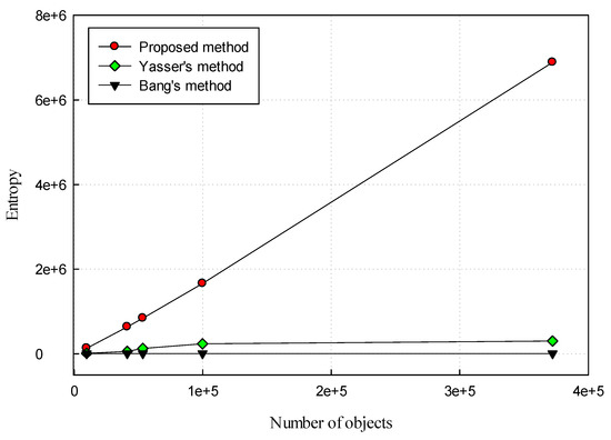 The method of Yasser [10] only uses the AES-256 cipher operator to encrypt the data stream of a shape-file. Thus, the entropy of this method is dependent on the length of the secret key and the length of the data stream. In the work of Bang [12], about 70% of polylines/polygons are selected for the encryption process. Bang used a common secret key to encrypt all DC values in a vector map in the DWT domain. The length of the secret key was 512 bits. Thus, the entropy of this method is dependent on the length of the secret key. We applied the methods of both Yasser and Bang for the GIS vector maps of Scotland for comparison. The entropy of our method was higher than that of Yasser (1.2 × 105 vs. 6.6 × 106 dB), while the entropy of Bang’s method was fixed at 4608 dB for every GIS vector map (Table 2). In conclusion, our method offers more security than previous methods. Figure 10 shows the difference between the entropy of our method and the entropy of the methods of Yasser and Bang according to the number of objects. The entropy of our method is much higher than that of Yasser or Bang.