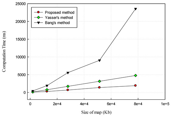 We implemented the proposed method using the C# language in Visual Studio 2013. We then conducted our experiments on a PC with Intel Core i7 Quad 3.5 GHz, 8 GB of RAM, and Windows 7 64-bit. Section 3 indicates that the computation time of the proposed method is dependent on the number of objects in the vector maps. With the GIS vector maps of Scotland, the computation time of our method ranged from 77 ms to 1896 ms, with the size of maps ranging from 1951 Kbs to 78,136 Kbs. We also implemented the methods of Yasser and Bang using the C# language in Visual Studio 2013, in a similar environment, to measure and compare the computation time between methods. Yasser performed full encryption for GIS vector maps, which means he encrypted notation, header, text, and all geometric objects. Thus, the computation time of Yasser’s method is dependent on the size of the GIS vector maps. Compared with Yasser’s method, the computation time of our method was less (40 ms vs. 2870 ms; Table 3). In the method of Bang, the computation time is dependent on the computation time of the selection process, the number of selected objects, and the computation time of the DWT and inverse DWT processes. The computation time of the DWT and inverse DWT processes is dependent on the number of vertices in each object. If an object has many vertices, the computation time of the DWT process is long. Conversely, if the number of selected objects is small, the computation time is short (Table 3). Figure 11 shows the computation times of the proposed method compared to the methods of Yasser and Bang according to the size of the vector maps. The time of the proposed method is significantly shorter than that of previous methods.