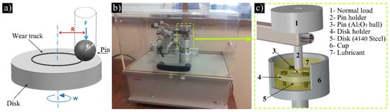 Sliding friction experiments were accomplished by a pin-on-disk configuration, which is commonly used to analyze the wear of a great variety of materials [6]. In this configuration, a pin (usually a ball) comes into contact with the disk surface that is attached to the equipment’s cup. Then, the disk starts to rotate, generating friction and causing a ring-shaped mark on the surface of the steel due to wear. The general configuration of friction experiments in a pin-on-disk apparatus is depicted in Figure 1a. Further, Figure 1b,c shows the CSM Tribometer (CSM Instruments, Peseux, Switzerland) employed and the configuration for the lubricated tests. In this work, disks of AISI 4140 annealed steel, whose composition has been previously reported [7], were prepared as in [6,7], thus obtaining a final arithmetic average of the roughness profile (Ra) of 0.04 µm. Commercial balls of alumina (Al2O3), whose diameter and surface roughnesses were 6 mm and 0.03 μm in Ra, respectively, were used as the stationary elements.