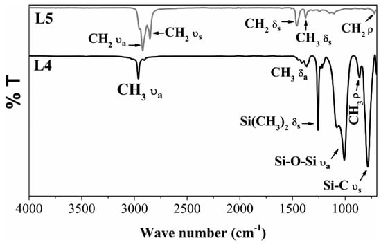 The ATR-FTIR spectra of the synthetic (L4) and mineral oils (L5) are shown in Figure 3. It can be seen that the spectrum of L4 exhibits the signals of polydimethylsiloxane. It has small peaks at about 2963 and 1410 cm−1 due to asymmetric stretching and bending vibrations of the CH3 group, an intense peak at 1259 cm−1 associated to the CH3 symmetric bending vibration in Si(CH3)2, a strong band between 1100 and 1000 cm−1 as a result of Si–O stretching vibrations in Si–O–Si, and peaks at 865 and 784 cm−1 attributed to the rocking vibration of CH3 around Si–C and the stretching vibration of Si–C, respectively [24,25]. As the signal located between 1100 and 1000 cm−1 unfolds into two components, it is inferred that the oil is of a long-chain length and, therefore, a high molecular weight, which was reflected in its high viscosity [24]. On the other hand, the L5 spectrum shows strong bands at around 2922, 2851, 1459, and 1374 cm−1 corresponding to the stretching and bending vibrations of hydrocarbons CH2 and CH3, and a small peak at 721 cm−1 caused by the vibration of CH2 that is characteristic of the degree of the refining process of a mineral oil [26].