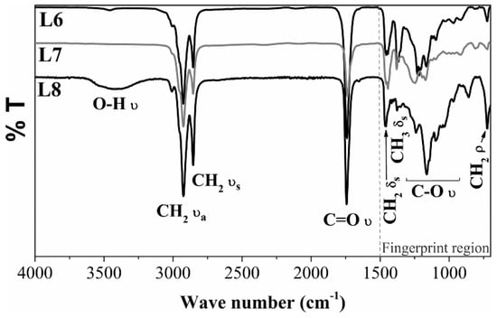 The ATR-FTIR spectra of the natural-based lubricants (L6, L7, and L8) are shown in Figure 4. Natural oils are triglyceride esters of fatty acids, and this triglyceride nature can be corroborated by the intense bands at around 1743 cm−1 that is the result of the stretching vibration of the ester group C = O. These spectra also show strong signals at 2924 and 2855 cm−1 corresponding to CH2 asymmetric and symmetric stretching vibrations, respectively. Additionally, each lubricant exhibits a different fingerprint region due to the type of natural oil and the other components present in the lubricants. For example, the peaks at 1460 and 1370 cm−1 corresponding to symmetric bending vibrations of CH2 and CH3 groups, are probably higher in L6 because it also contains a fraction of mineral oil. On the other hand, it is important to note the broad band at about 3430 cm−1 belonging to vibrations of the O-H group in L8, which is a characteristic of Castor oil.