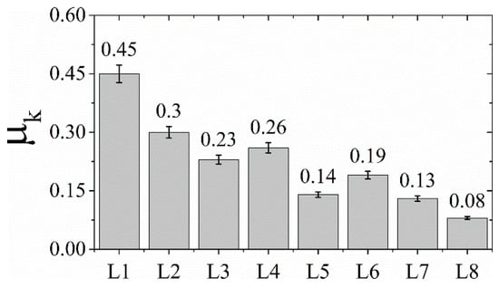 The effect of lubricants on the kinetic friction coefficient (μk) is graphed in Figure 5. In general, it can be seen that the bio-based lubricants produced the lowest friction coefficients; friction was reduced up to 82.2% with the neat Castor oil compared to the highest value achieved with water (L1) as a lubricant (μk = 0.45). It can be observed that the water-based lubricants (L1, L2, and L3) caused the highest friction of the system. This behavior was expected since the water-based lubricants were estimated to operate in boundary lubrication and to achieve the lowest film thicknesses. This caused a higher number of asperities to come into contact, and, therefore, the force necessary to allow the sliding was greater. The synthetic oil (L4), despite having higher viscosity and lubricant film thickness, produced a higher friction coefficient than the lubricant made of water with graphite nanoparticles (L3) and the mineral oil (L5). Even though mineral oil (L5) worked under boundary conditions, it was observed to generate similar friction to the bio-based lubricant with synthetic esters (L7) and even less than that with mineral oil (L6).