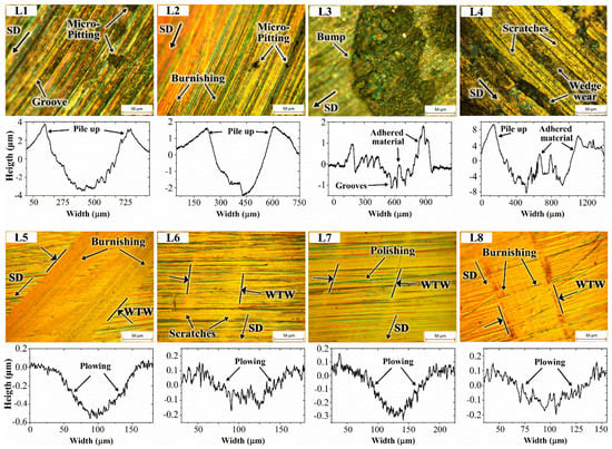Figure 6 exhibits optical micrographs of the worn surfaces and the wear track profiles of the steel samples tested with each lubricant. It can be noticed that the samples lubricated with water-based lubricants (L1 and L2) experienced very similar abrasive wear, presenting different wear phenomena like grooves, burnishes, and micro-pitting, mainly. Moreover, their wear track profiles exhibited accumulated material at the ends of the wear track (pile-up). However, on the sample lubricated with graphite nanoparticles in water (L3), bumps and some grooves characteristics of adhesive and abrasive wear can be observed. Practically speaking, the steel samples lubricated with the synthetic lubricant (L4) were the most affected. They suffered abrasive wear that generated scratches and wedge-like wear, and, according to the wear profile, there was also adhered material at the center of the wear track. On the other hand, the mineral (L5) and bio-based lubricants (L6, L7, and L8) generated the lowest wear of the steel samples principally by abrasion. The optical micrographs of these samples exhibited burnishing, scratching, and polishing marks, while the profiles confirmed a slight plowing effect.