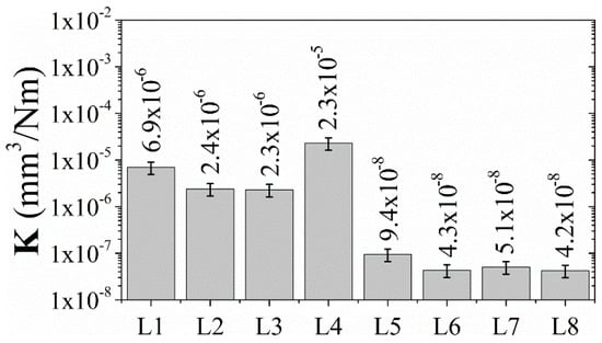 The observed damage of the steel was corroborated by computing the wear rate (see Figure 7). It can be seen in Figure 7 that the lowest wear rate values were achieved with all the bio-based lubricants (L6, L7, and L8). The wear rate obtained with L8 was up to 99.8% lower than that found with the synthetic lubricant L4 (K = 2.3 × 10−5 mm3/Nm).
