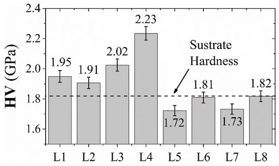 In boundary lubricated systems (which were achieved with lubricants L1 to L5), mechanical effects can occur, and these affects can be reflected by a change in the hardness of the materials on the worn zone [3]. This phenomenon can affect the performance of the machinery because, if hardness changes, both friction and wear can increase. In this work, as the systems operated in boundary and mixed lubrication conditions, the microhardness on the worn zone of the steel was affected according to the lubricant employed, as can be observed in Figure 8. It can be seen in this figure that the microhardness of the samples lubricated with water-based lubricants (L1, L2, and L3) and the synthetic oil (L4) increased in relation to the initial substrate hardness. Specifically, the hardness of the sample lubricated with L4 increased up to 22.5%. The opposite phenomenon occurred with the samples lubricated with mineral oil (L5) and bio-based oils L6 and L7, which showed a slight decrease in microhardness. It is important to note that the neat natural oil (L8) did not produce alterations in its substrate hardness, instead keeping its initial micro-hardness substrate value.