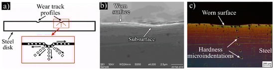 Hardness measurements on the transverse plane: (a) general schematization, (b) SEM, and (c) optical micrographs of the sample lubricated with L4. Note: the SEM micrograph was taken in a Jeol JSM-6510LV Scanning Electron Microscope.