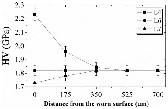 In order to deepen the change of hardness of the steel samples as an effect of the lubrication process, three representative samples were cut transversely, polished, and analyzed. Then, new measurements were made on the transverse plane, as illustrated in Figure 9. The first sample was the lubricated one with synthetic lubricant (L4), with the highest increase in hardness; the second used the natural-based oil with synthetic esters (L7), whose hardness decreased; and the third used the natural-based lubricant with mineral oil (L6), whose hardness was not affected. The hardness on the transverse planes, from the surfaces to the substrates, was graphed and can be observed in Figure 10. It can be seen in this figure that the change in the microhardness of the steel did not only occur near the worn surface but also affected a considerable distance of the bulk substrate. These distances indicate the intensity of damage (boundary layers) that the lubrication process produced on the material and are also an indication of the effectiveness of the lubricants. In this sense, it can be seen that the bio-based lubricant with synthetic esters (L7) affected up to 175 μm of the material, the synthetic lubricant (L4) affected 350 μm, and the bio-based lubricant with mineral oil (L6) only affected the surface of the material.
