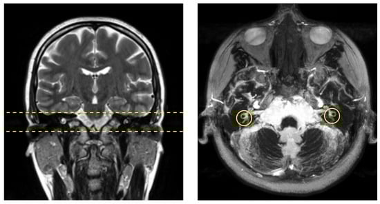 Subject imaging acquisition example: (left) volunteer coronal FSE localizer. Dashed straight yellow lines delimit the slab where the CISS-3D sequence was applied; and (right) cumulative projection of the CISS-3D sequence that includes the vestibular system, where semicircular ducts can be easily detected. The yellow circumferences denote the region where our study was conducted.