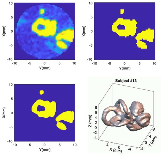 In the last panel, we present an isosurface that corresponds to 20% of the maximum intensity value in the interpolated image. This value is used as a threshold for the binarization in the whole group of volunteers. The specific value used as threshold is not critical, as far as it remains far from the two extrema (the values inside and outside the canals).