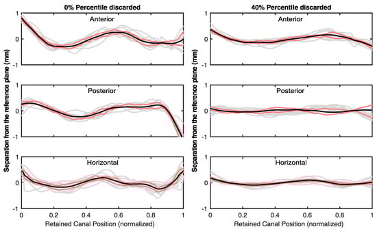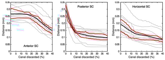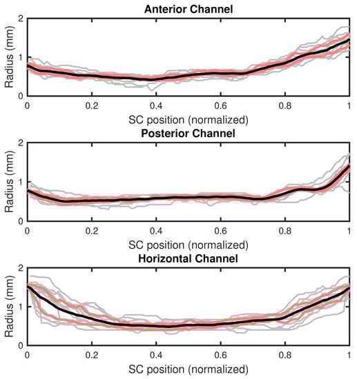 Depending on the cupula section considered as part of the semicircular ducts, the planes that represent the canals show slight differences. For each point of the original trajectory, we computed the distance from the surface of the volume . In Figure 4, we present these values for all the canals and volunteers. As the different canals have slightly different sizes, we normalized the position along each duct with its corresponding length. The variability of the canal radii between different volunteers (gray lines) and along the canal position is larger than the uncertainty due to the algorithm (i.e., the size of the binarized voxel).