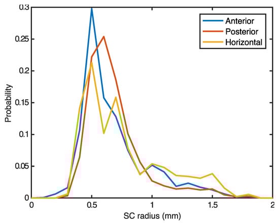 A histogram of the whole data gives an accurate approximation of the SCs’ radii (Figure 5). There are no data for radius smaller than 0.3 mm, being the mode within 0.5–0.6 mm for all ducts, which corresponds to the value obtained on the central regions (Figure 4). In contrast, the extreme values of the plots show an increase of the radius value that can be up to three times (1.5 mm) the central region radius. These last values correspond to the ampullæ.