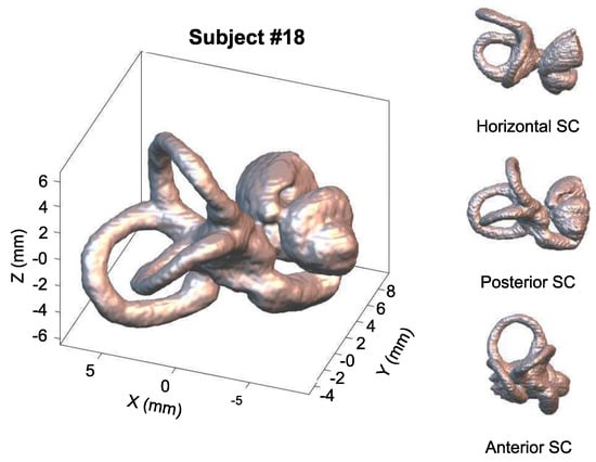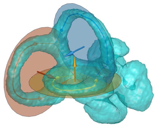 - Kim, D.K.; Kim, D.R.; Jeong, S.H.; Kim, G.J.; Chang, K.H.; Jun, B.C. Analysis of the coplanarity of functional pairs of semicircular canals using three-dimensional images reconstructed from temporal bone magnetic resonance imaging. J. Laryngol. Otol. 2015, 129, 430–434. [Google Scholar] [CrossRef] [PubMed]