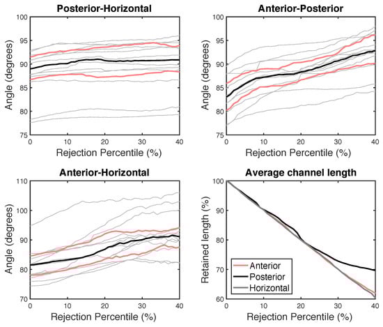 Figure 8 shows the SCs Anterior–Horizontal (AH), Anterior–Posterior (AP) and Posterior–Horizontal (AH) pairs’ angles as a function of the percentile chosen for rejection. The results show that in some cases there is a clear dependence of the computed SCs pair angle on the rejection threshold. PH angle presents the most regular behavior, with a plateau close to regardless of the discarded region. Nevertheless, there are two volunteers whose angles are around 80.
