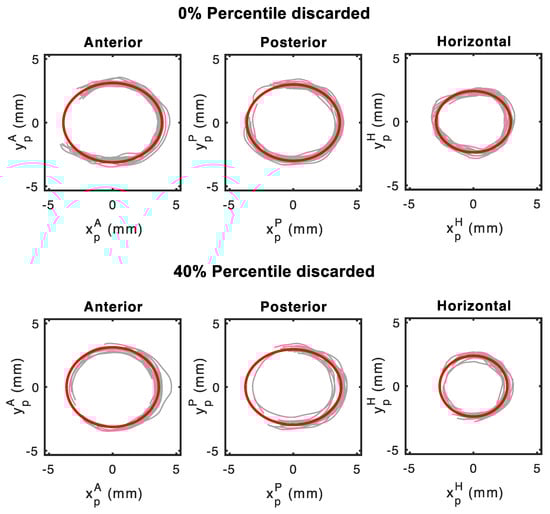 As in previous works, we verified that the centerlines are very close to ellipsoidal trajectories, thus we extracted the parameters that can be obtained from the individual paths. A least square fitting was done (based on an algebraic distance) for each volunteer and canal. Figure 11 shows in red the ellipse whose semi-axes are the average of the whole set of ellipses that better describe each of the SCs projected on its corresponding plane. We present two situations, retaining all the duct or with a rejection threshold of 40%. The individual trajectories appear in gray in the same figure. It must be noted that the ampullæ position, in most of the cases, is located at one end of the major axis.