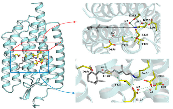 X-ray crystallographic structure of Chlamydomonas reinhardtii channelrhodopsin-2 (CrChR2) (PDB: 6EID [10]). The protonated Schiff base of retinal and the side chains of key residues are shown as grey and yellow sticks, respectively. Water molecules are shown as red spheres. Dashed lines indicate hydrogen-bonding interaction.