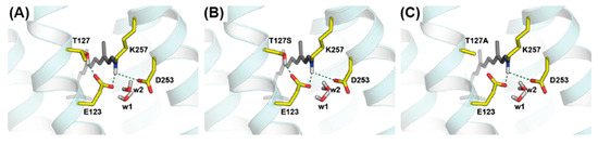 From these results, we assigned the lower frequency of the C=N–H vibration at 1661 cm−1 to the Schiff base being hydrogen-bonded to a water molecule and/or directly to D253. In this scenario, the substitution of T127 by A did not affect the frequency of the Schiff base vibration, as this residue did not interact directly with D253. This explained the low-frequency shoulder of the C=N–H band at 1661 cm−1 which did not shift after amino acid exchange. The high-frequency band at 1674 cm−1 in T127A corresponded to the population in which E123 was hydrogen bonded to the Schiff base and, with respect to the WT, lacked the hydrogen bond to the threonine (see Figure 2, right panel).