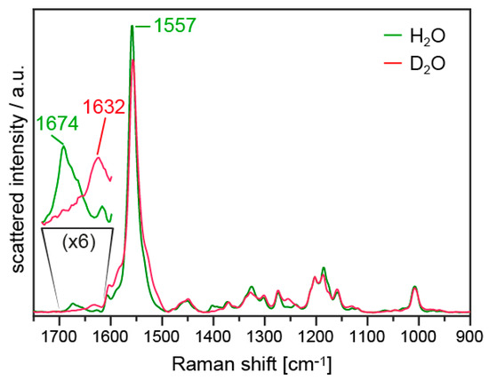 Resonance Raman experiments were performed essentially as described in Reference [19]. Briefly, 5 µl of concentrated sample (5–10 mg/mL) was dried and rehydrated on a quartz crucible and subsequently cooled to 80 K using a N2 cryostat (Linkham). Rehydration occurred prior cooling via vapor diffusion of 3 µl of either H2O/glycerol or D2O/glycerol mixtures (8/2 w/w) placed in the vicinity of the sample. The emission line at 457 nm of a diode-pumped solid-state (DPSS) laser (Changchun New Industries Optoelectronics Technology Co., Ltd., China) was used to induce Raman scattering.